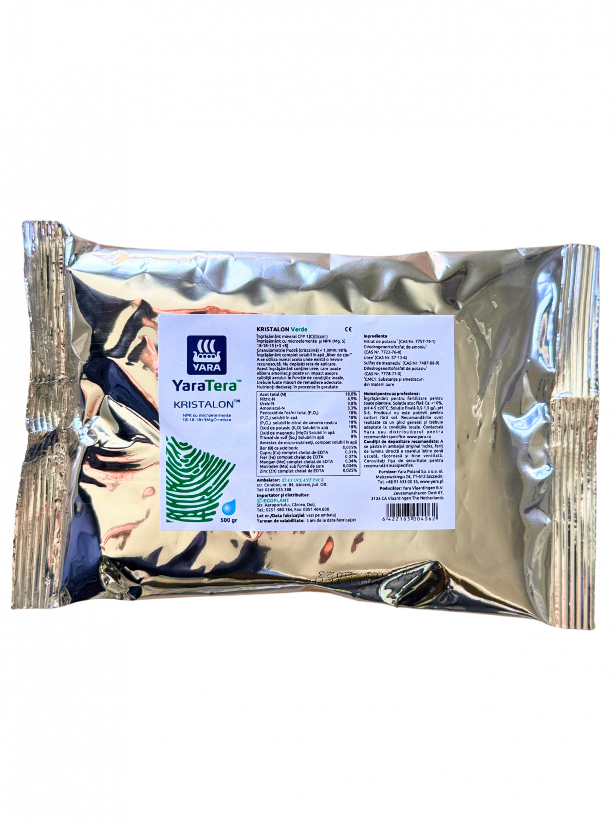 KRISTALON este fabricat in Olanda de compania Yara , lider mondial ca producator si distribuitor in domeniul ingrasamintelor chimice pe baza de azot. Este un ingrasamant chimic complex, pe baza de azot, fosfor, potasiu si microelemente, complet solubil in apa, ce poate fi aplicat prin stropire foliara la culturile de camp,sau prin fertigatie la legume.