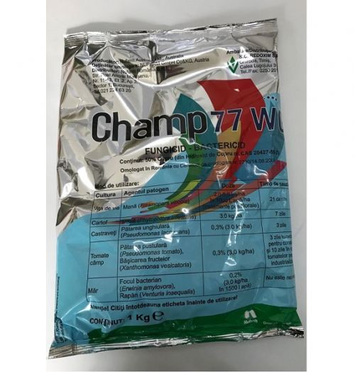 Champ 77 WG este un fungicid/bactericid ce se prezinta sub forma de granule fine, omogene, fara tendinta de sfaramare, de culoare bleu vernil. Acesta stimuleaza rezistenta naturala a plantelor, contribuind la combaterea integrata a patogenilor, in strategia impotriva crearii rezistentei la fungicidele sistemice, acesta avand efect fungicid si batericid.