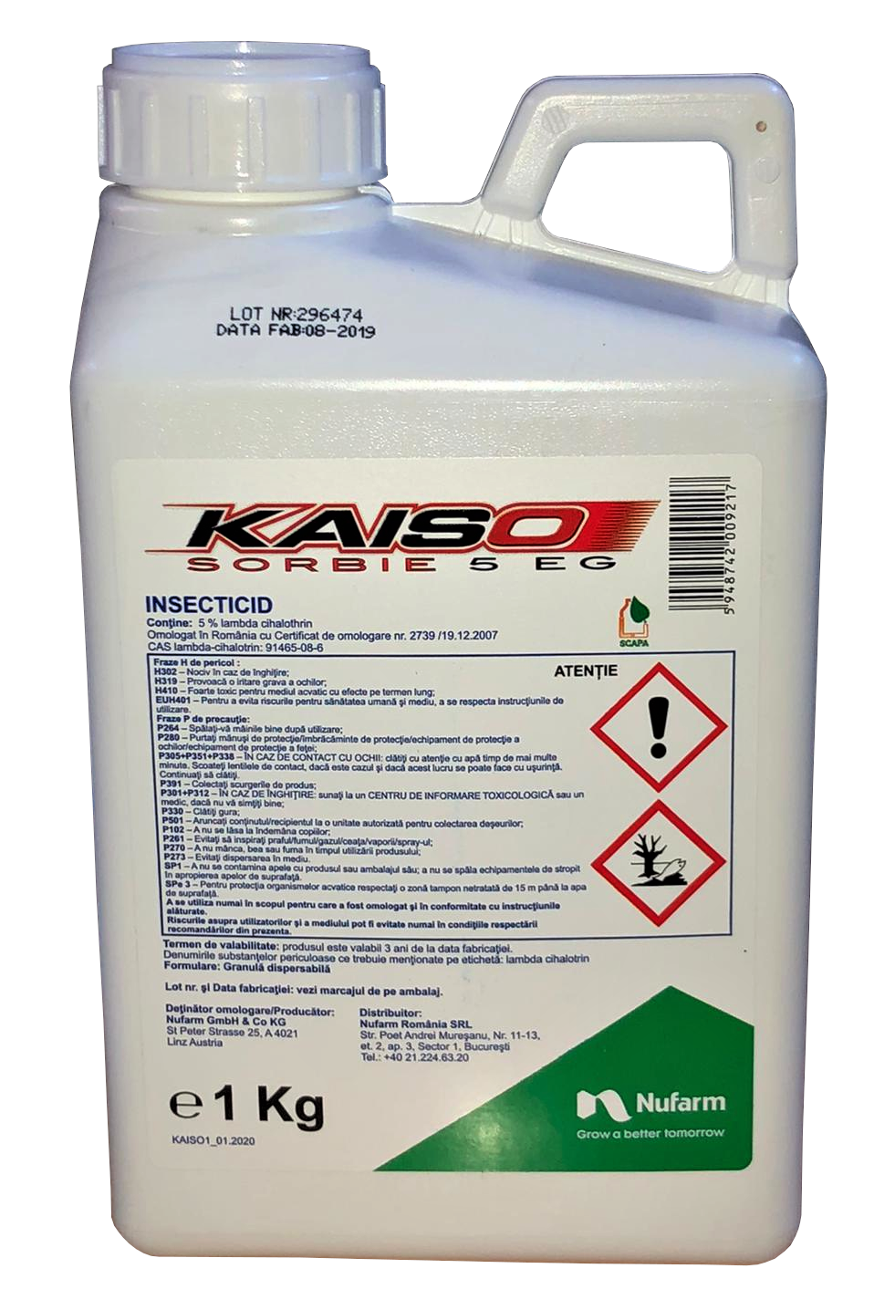 Kaiso Sorbie 5 EG este un insecticid din grupa piretroizilor premium, ce actioneaza atat prin contact cat si prin ingestie asupra unui numar mare de insecte daunatoare, avand si actiune ovicida.